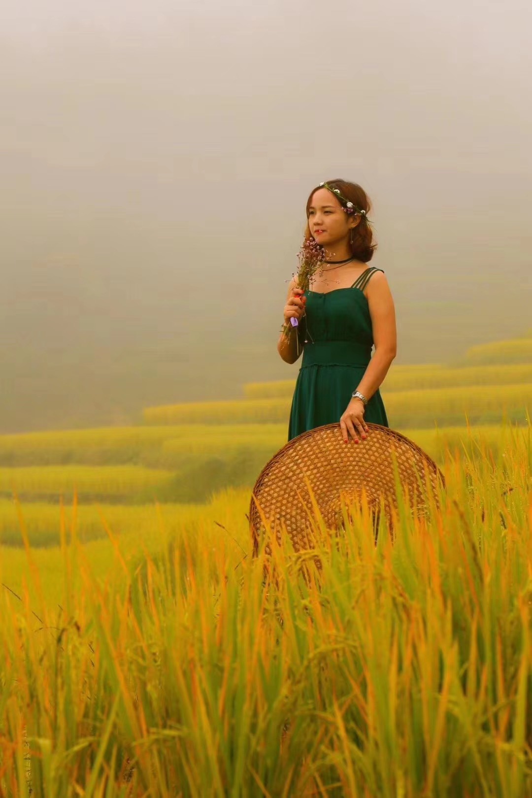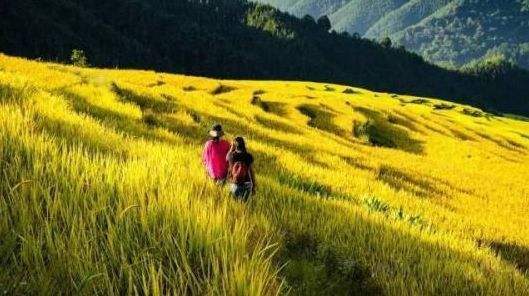 09:30到达梯田,结伴玩耍,大伙可以帮忙多拍点照片,体验农家的生活。阳光打在接近收割的梯田上,放眼望去一片金色非常震撼;