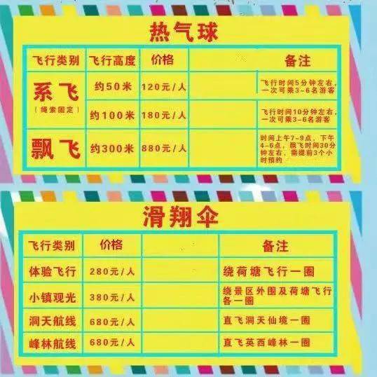 热气球、滑翔伞参考价格如下,以景区实际为准