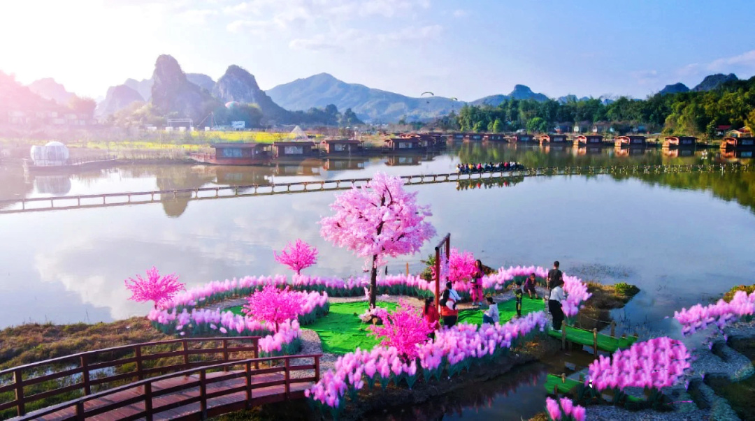 中国美丽乡村百佳范例 ,占地约8000多亩,地处于九龙镇英西峰林核心段,内有千多座呈线型排列的石灰岩质山峰,山势雄伟,景色奇特,大小溪涧、河流穿绕其间,千姿百态的山峰、神秘莫测的岩洞、嶙峋怪异的岩石、变化无穷的云海、雾景、浓郁乡土气息的田园风光,千亩花海烂漫盛开,置身其间,风光绮丽、景致醉人,大有蓝天、青山、碧水回归大自然的神韵,