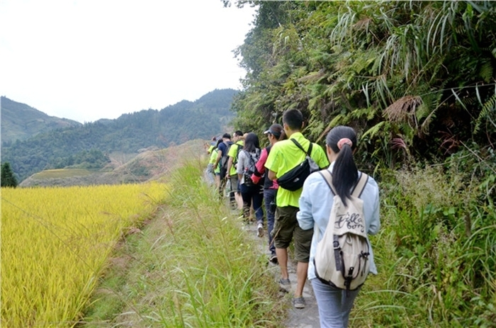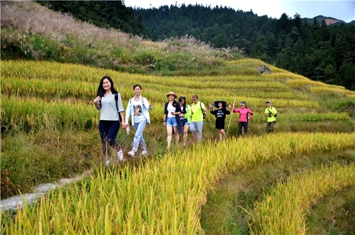 15:00之后领队带领大家登上平安寨的观景台观赏夕阳下的龙脊梯田美景,也可以去田间和黄金稻谷亲密合影。