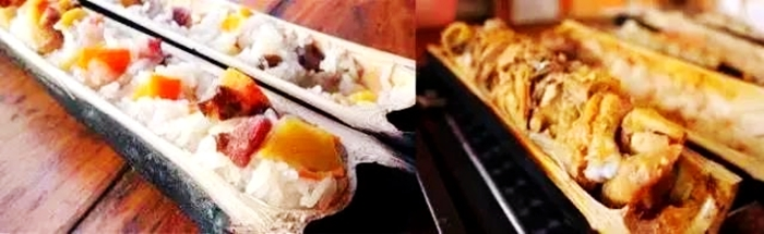竹筒饭即使用竹子烘烤出来的米饭,内有五谷杂粮与碎肉,带着竹子的清香,清甜滑口。