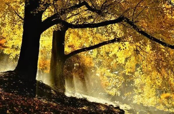 每到深秋季节,微风轻拂,落叶缤纷,树上树下一片片落叶就象一片片黄金,与林下拾叶子的老人或孩童,构成一幅幅别有韵味的秋意图。