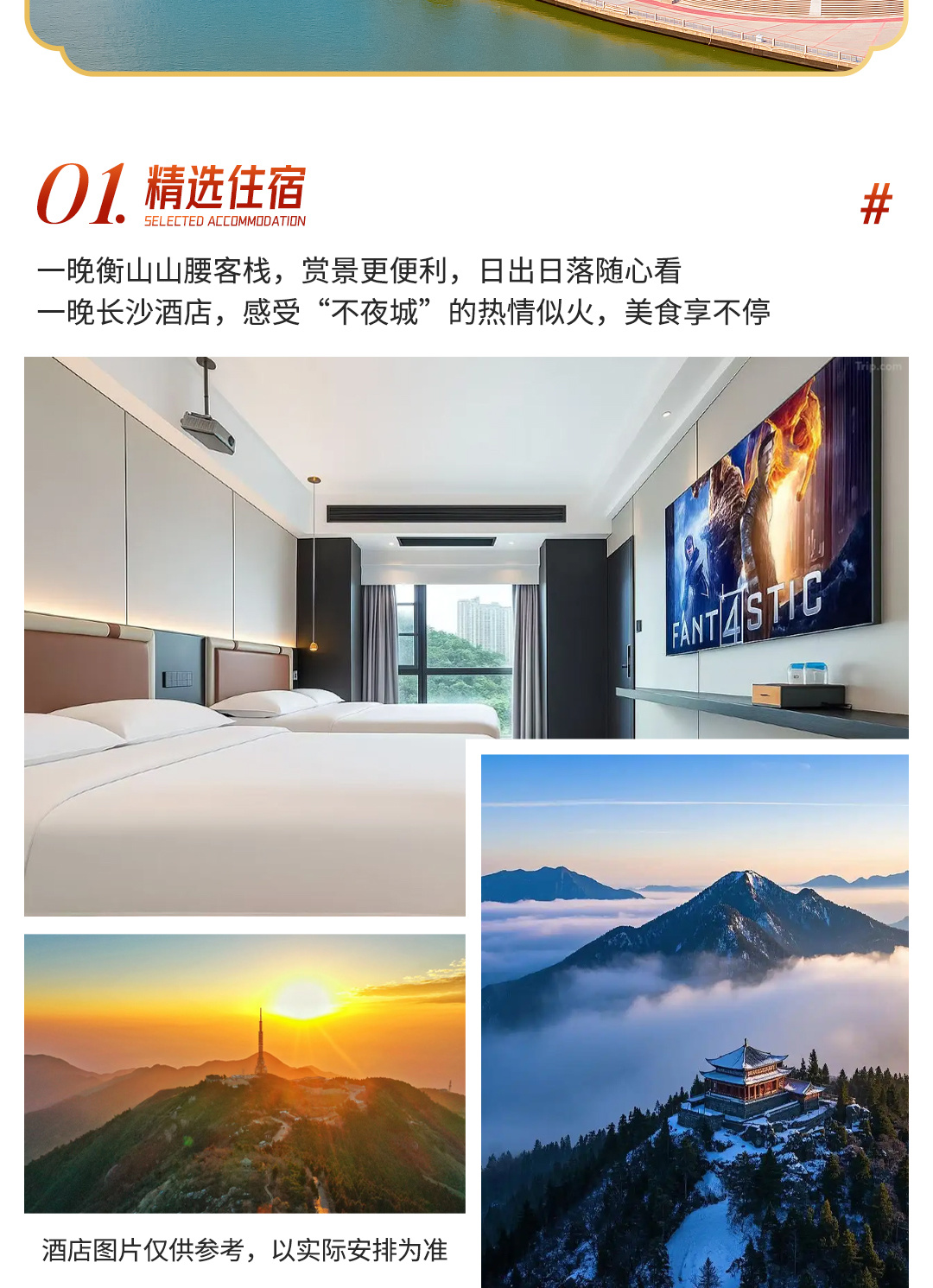 需要看日出的5点起床(记得收拾完所有行李,放在领队指定位置,领队会协同酒店将行李送到游客中心,届时认领自己的行李),徒步前往日出观景台,静等日出。后前往衡山最高点,祝融峰跟大队伍集合。