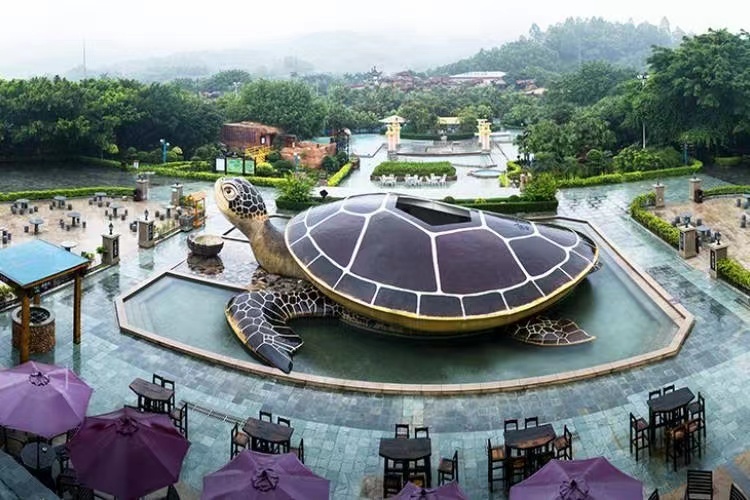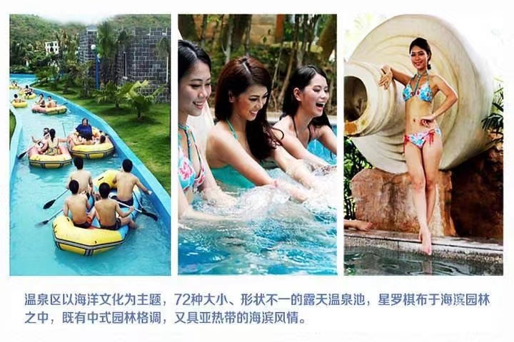 这里温泉游乐区以海洋文化为主题,72余种大小、功能不一的露天温泉池,星罗棋布于海滨园林之中:有温馨浪漫的情侣池屋;有健身调元的各式加料养生温泉,可以在养生区里的大海龟的肚子里泡长寿泉,也可以躲在大葫芦里享受中药浴,还可以在大紫砂壶里尽情享受香茶浴;而中华温泉水疗区更是受人喜爱,是爱美之士护肤美容的好地方。