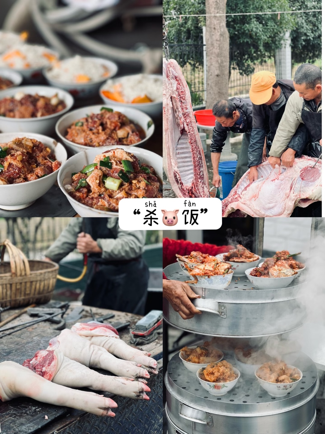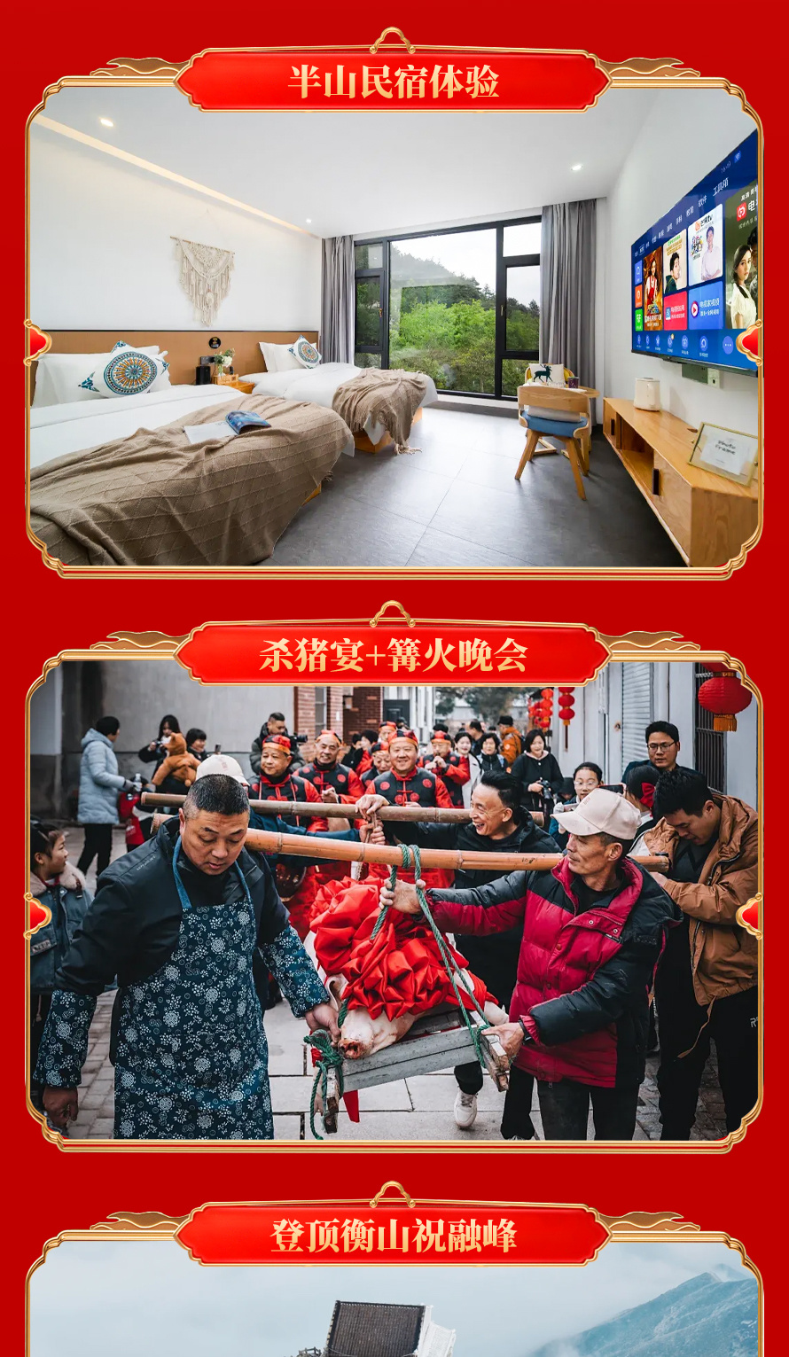 - 15:00-17:00 办理入住,休息放松,拍山景,参与杀猪,一起按猪,分猪肉,起火做大餐,写对联写福送福。