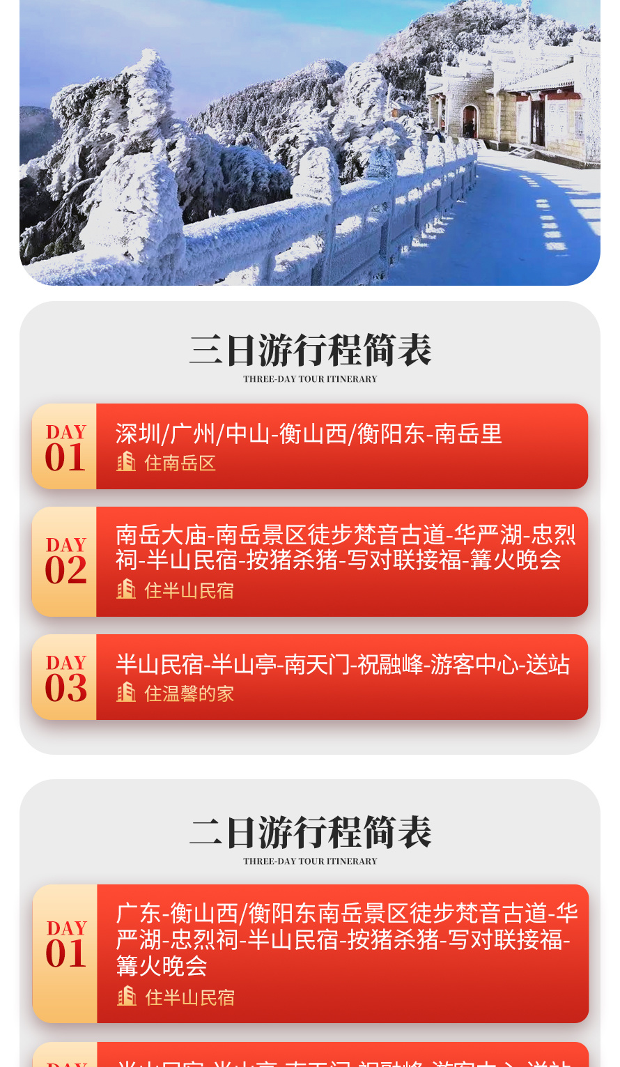 - 07:00-10:30 深圳北/广州南/中山站-衡山西站(高铁约2-2.5h,到达南岳区自行解决午餐