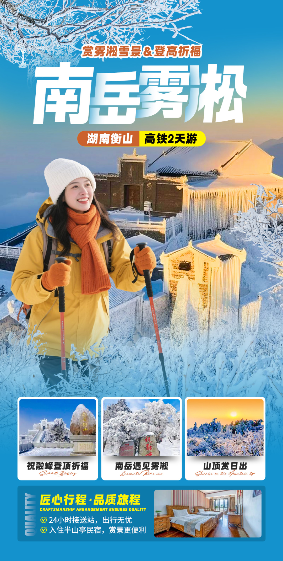 不看日出的早上8:00起床早餐后集合出发徒步前往祝融峰山顶沿途欣赏狮子岩、观音岩、上封寺等景点。(雾凇雪景和日出都属于自然天气景象,山顶未必有雪或无法看到日出,行程介绍只作为参考)