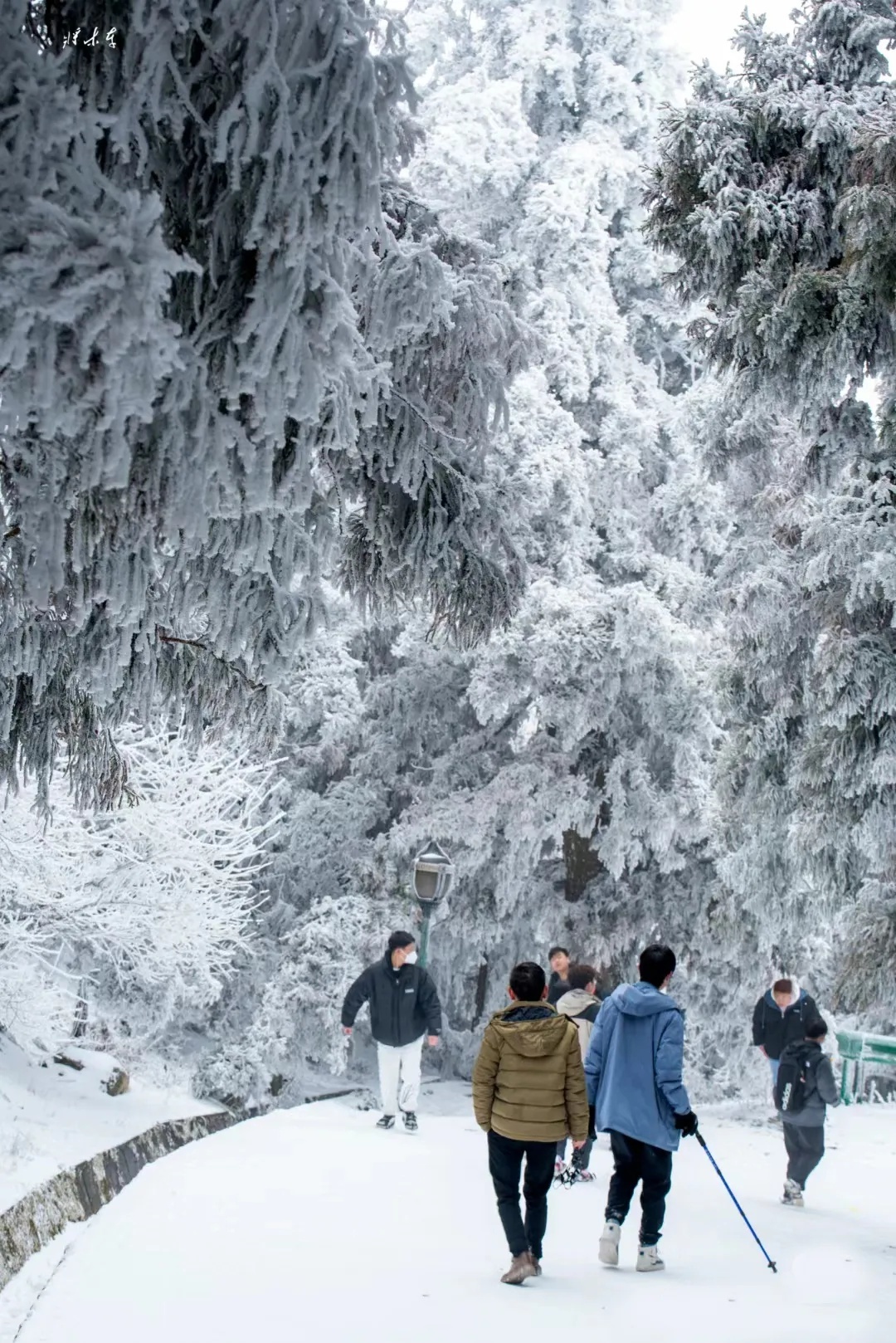 在祝融峰观冰赏雪是别有趣味的,山顶雪花飞舞,银妆素裹,山腰玉树环枝,晶莹欲滴,山下则一片青绿,是南国特色的雪景。