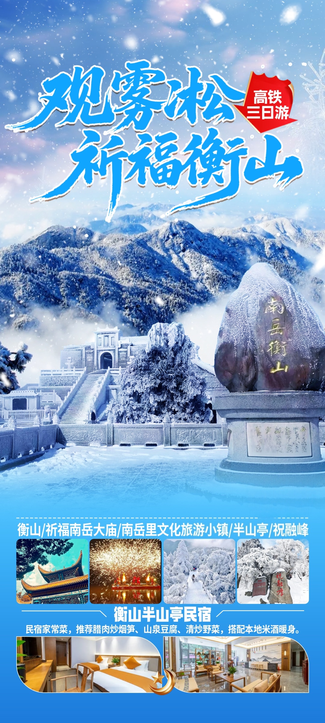 1. 徒步:半山民宿→磨镜台→南天门→上封寺→祝融峰,全程约5公里,海拔上升400米,耗时2.5小时,沿途赏晨雾、云海(运气好可见)。雾凇雪景和日出都属于自然天气景象,山顶未必有雪或无法看到日出,行程介绍只作为参考)