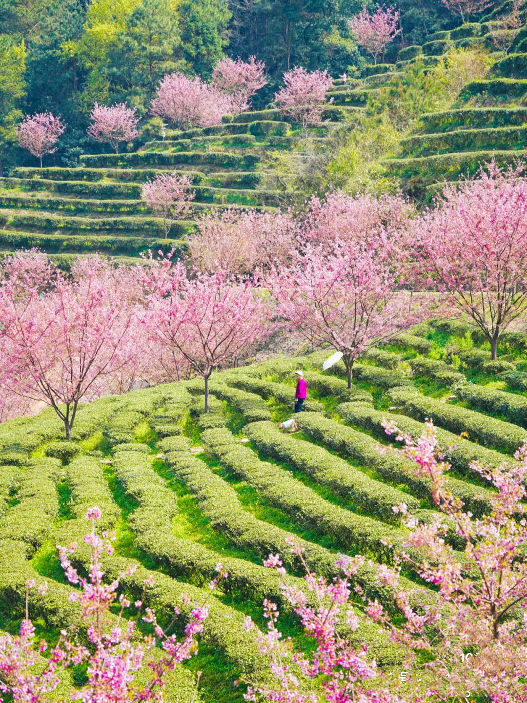 千亩茶园,万株樱花,迎春暂放,漫山遍野的粉色花朵,点缀在四季常青的茶园内,层层叠叠,烂漫无比,深深吸上一口充满花香与茶香的空气,沁人心脾...