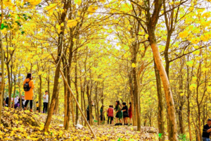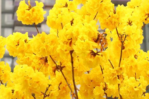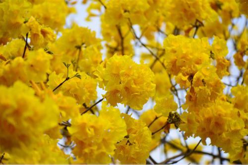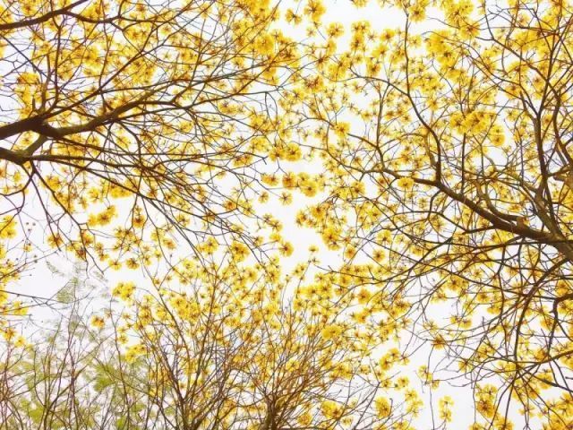 1万多株黄花风铃,步入林中,只见黄灿灿一片,树下五彩缤纷,满树黄花不见一片叶子,真正是满城尽带黄金甲