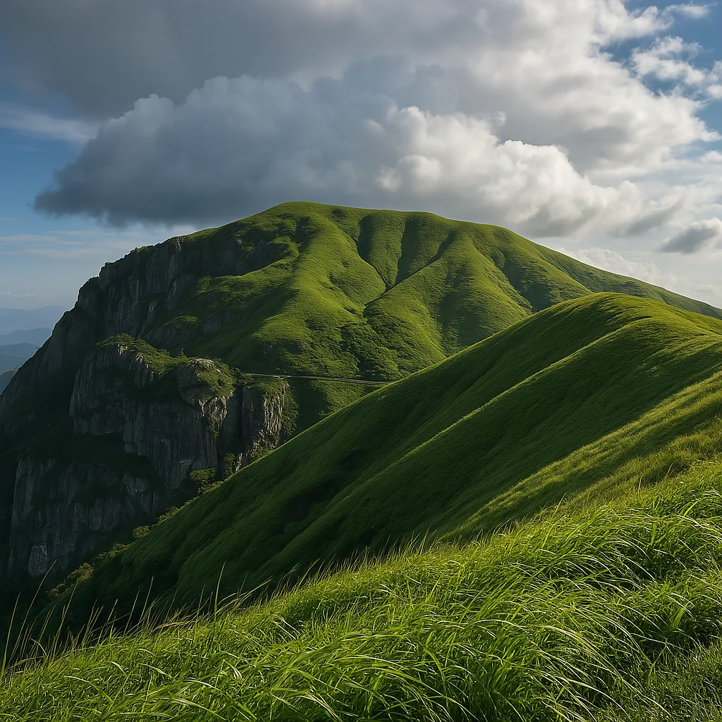 千丈岩:陡峭岩壁与草甸相接,呈现地质变迁的痕迹。