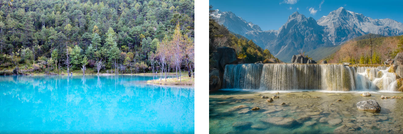 【蓝月谷】被誉为“小九寨”。玉龙雪山冰雪融化成河水从雪山东麓的一条山谷而过,因月亮在蓝天的映衬下倒影在蓝色的湖水中,又因英国作家瞻姆斯希尔顿笔下的《消失的地平线》中的蓝月亮山谷近似于此,故名“蓝月谷”。谷中的河水形成了四个较大的水面,人称“玉液”湖、“镜潭”湖、“蓝月”湖和“听涛”湖。湖光山色,景色优美,被誉为丽江的“小九寨”。