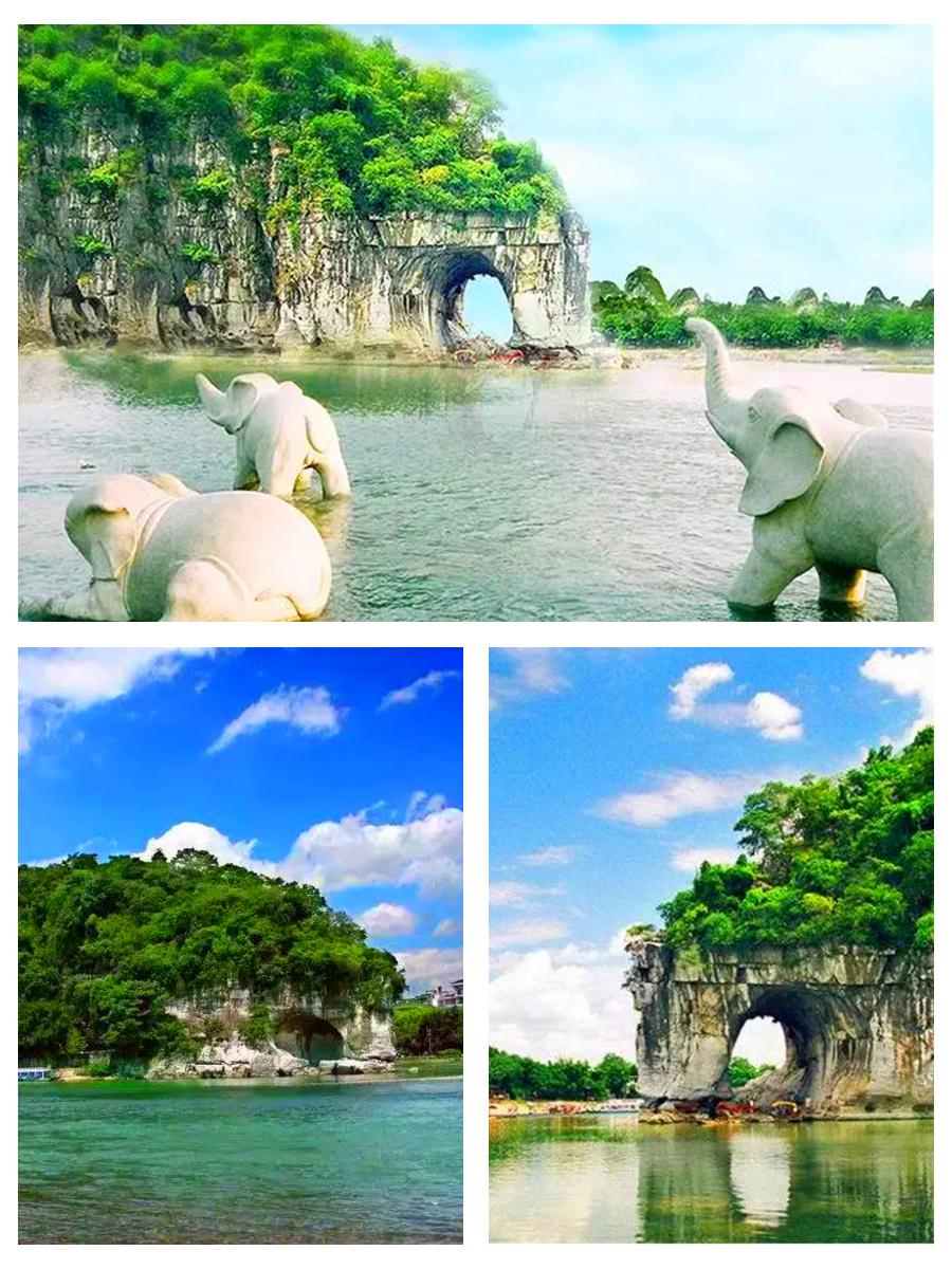 导游接站后前往游览桂林市的标志---象鼻山,象山以神奇著称。其神奇,首先是形神毕似,其次是在鼻腿之间造就一轮临水明月,构成“象山水月”奇景。因此,象鼻山是桂林的城徽山,是桂林旅游的标志山,它坐落在桂林市中心的漓江与桃花江汇流处,形似一头巨象,象鼻和象腿之间是面积约一百五十平米的圆洞,江水穿洞而过,如明月浮水。坐落西岸的象山水月与漓江东岸的穿月岩相对,一挂于天,一浮于水,形成“漓江双月”的奇特景观。
