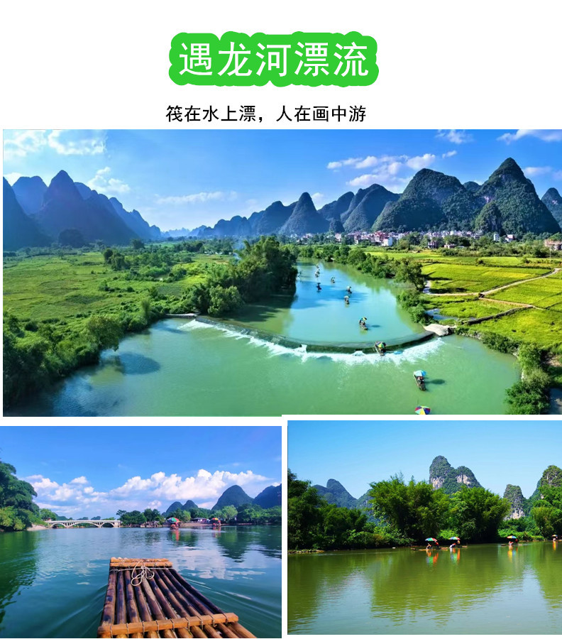9:00【遇龙河多人竹筏】(门票已含,游览时间约为1.5小时)人称“小漓江”,不是漓江胜似漓江。在其上泛舟漂流,赏两岸桂林山色,才不虚此行。两岸山峦百态千姿,河畔翠竹叠嶂,蕉临四季常青,沿岸地稻田一年四季颜色不断变化,田野里一片生机勃勃,诗情画意尽显其中。