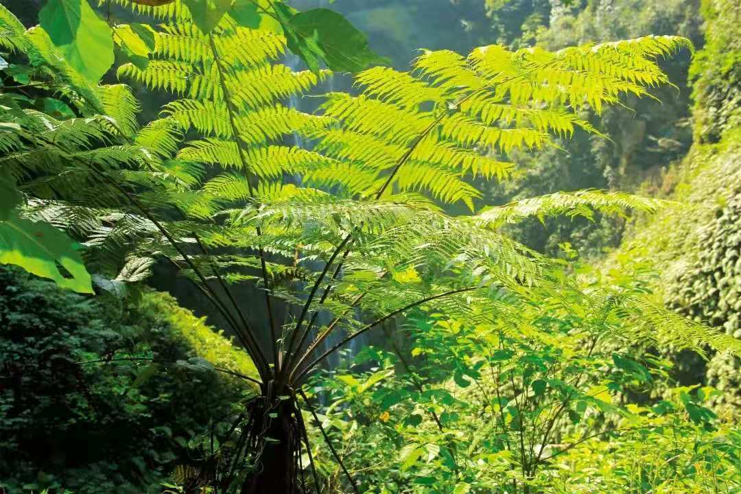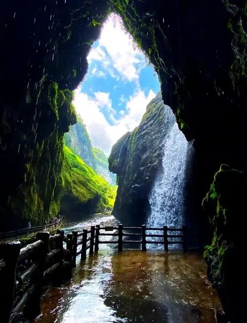 汹涌清澈的河水一头扎进"天坑",形成一个单程高达160多米的瀑布倒挂前川。雨季来临,峡谷内瀑布声如滚滚春雷;震耳发聩;旱季时节,峡谷内瀑布声如喧哗闹市,令人神往。更令人称奇的是,从天而降的大瀑布与从地下突然冒出的长约800米的地下河交汇,一起进入瀑布下方一个叫鸳鸯潭的深潭后,便又悄没声儿地消失在地下河中,不管多大的水都无法淹没峡谷。步入峡谷,但见古树老藤遮天蔽日,珍稀植物种类繁多,山涧清流急喘直下,溶洞景观天然独特。而隆隆的大瀑布则给大峡谷更增添了神秘莫测的色彩和无比壮丽的景观
