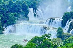 它横跨中越两国,与[越南板约瀑布]相连,宽200多米,落差70多米,纵深60多米, 年平均水流量是黄果树瀑布的三倍,瀑布气势磅礴,三级跌落,声势浩大,无论远观近看,其魄力、其气势、其风采,都让人震魂摄魄