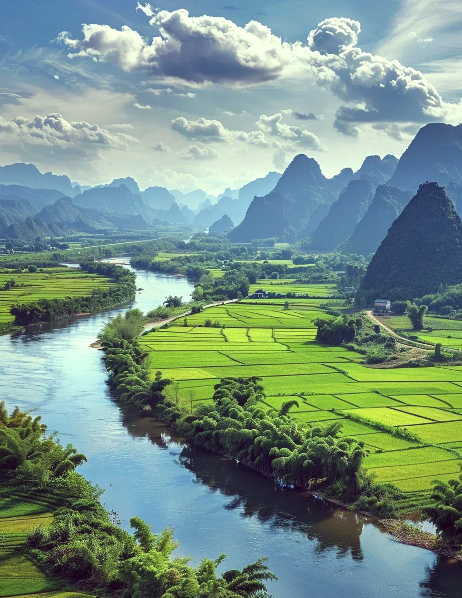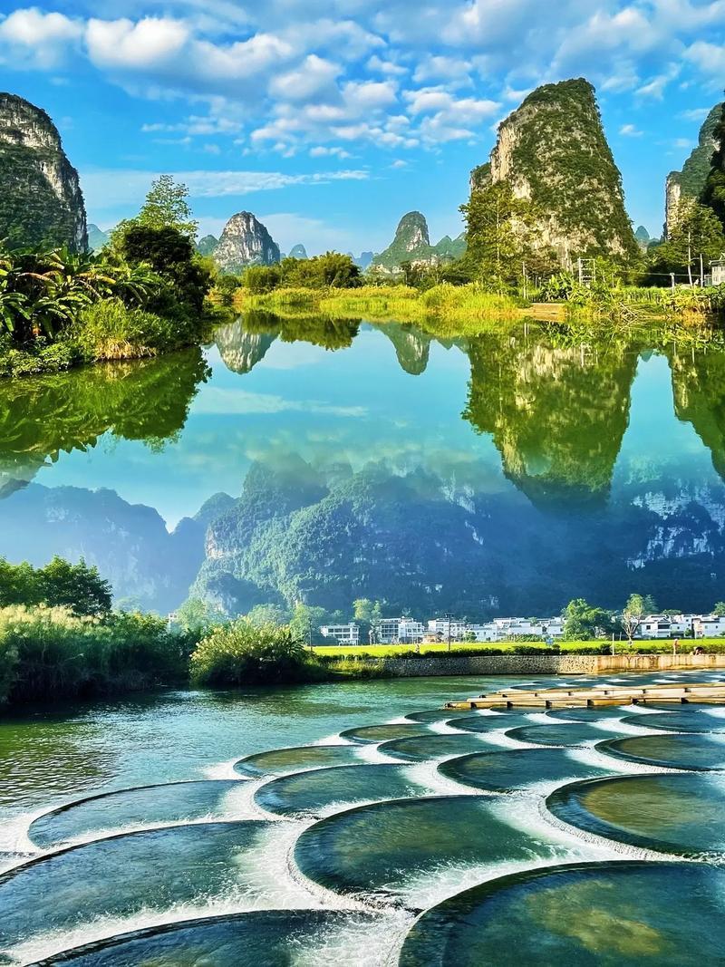 明仕田园风光水秀,山环水绕,素有小桂林之称。这里翠竹绕岸,农舍点缀,独木桥横,稻穗摇曳,农夫荷锄,牧童戏水,风光俊朗清逸,极富南国田园气息。