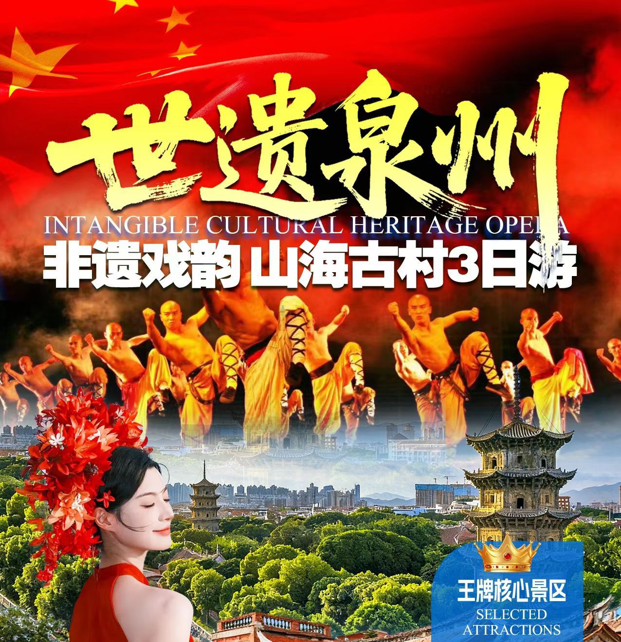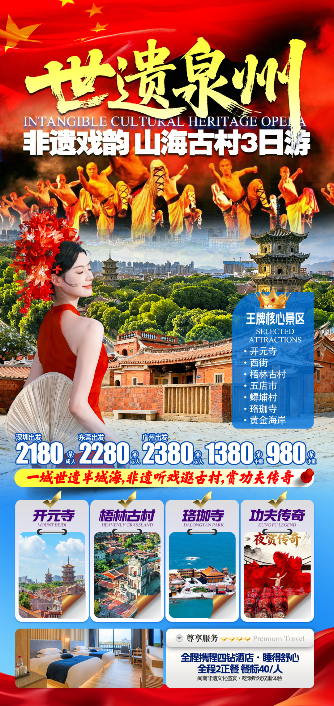 【观《功夫传奇 2》大型剧场】(观看约 1 小时,晚场14:00分) ;来泉州,别错过《功夫传奇 2》!这部由中国旅游集团打造的大型实景功夫剧,驻场泉州西街影剧院,是泉州文旅融合的代表之作。剧情聚焦武僧纯一的成长:从青涩习武到历经磨砺,再到悟得武道真谛,故事跌宕起伏,引人入胜。演出打破常规,将武术与杂技、魔术融合 —— 拳风凌厉、高空动作惊险、魔术变幻无穷,沉浸式体验直击人心。更有浓郁闽南风情:古厝骑楼布景、传统音乐、泉州非遗技艺巧妙融入,让观演不止于功夫欣赏,更能感受闽南文化魅力。无论你是功夫爱好者、文化探寻者,还是亲子家庭,都能在此收获感动,快来打卡这场必看的功夫盛宴!