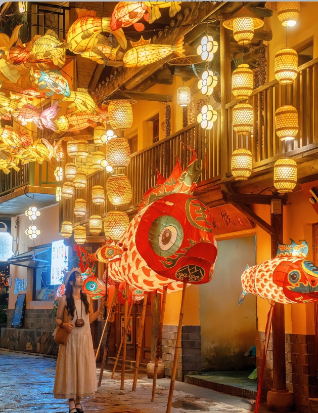 1️⃣ 百米鱼灯长龙 🐉 非遗匠人手工扎制的10盏大鱼灯,及游客朋友DIY的小鱼灯,夜幕下如星河游动!推荐在古城迎阳门,文昌井,老城土菜馆门口蹲守C位视角📸