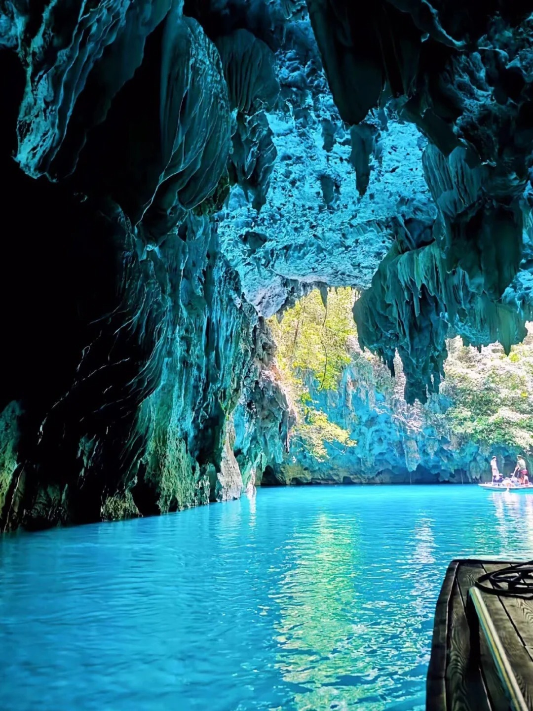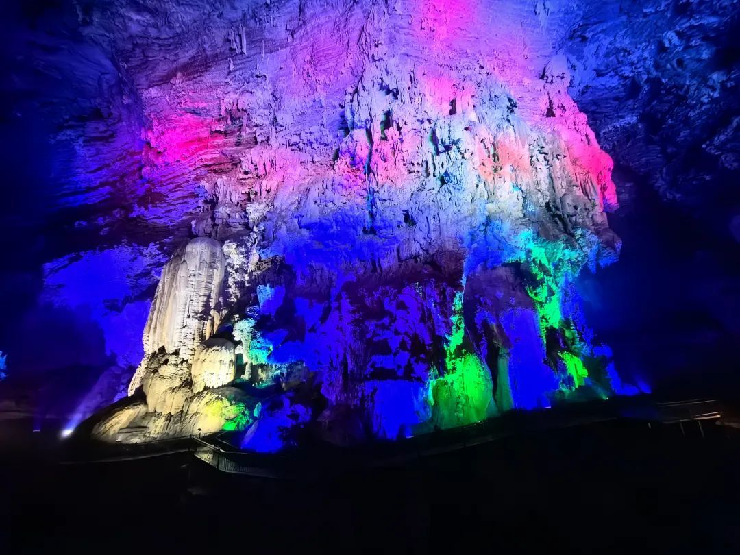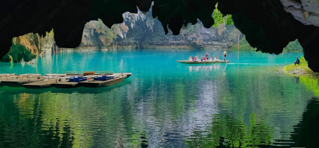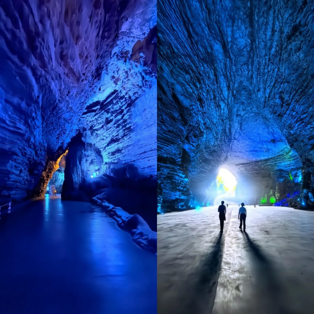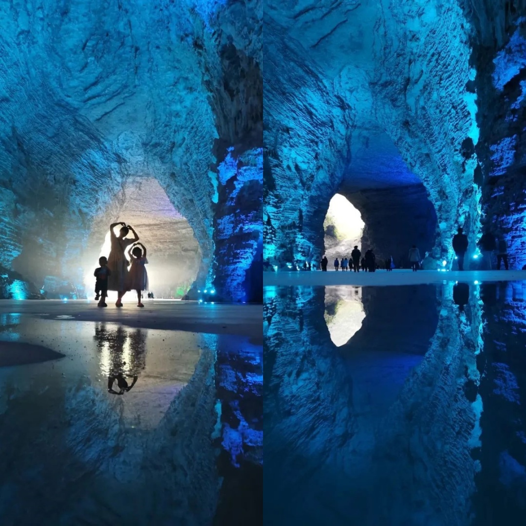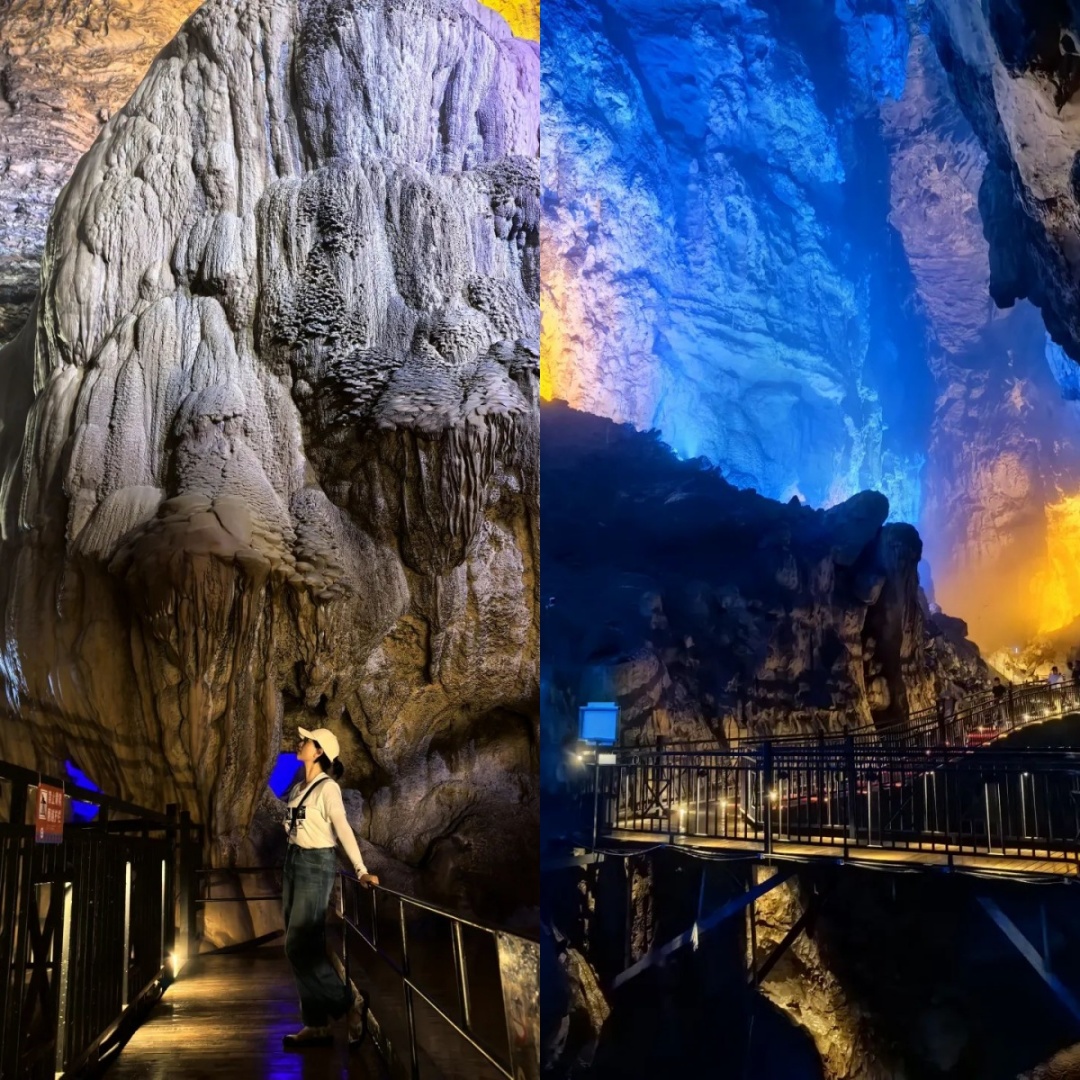 低头俯瞰,脚下是暗流涌动的地下河,清澈的河水倒映上方的钟乳石,虚实交错间更添几分神秘与幽邃。洞中恒温16℃左右,能让你在大自然的空调房中卸下一身暑气。