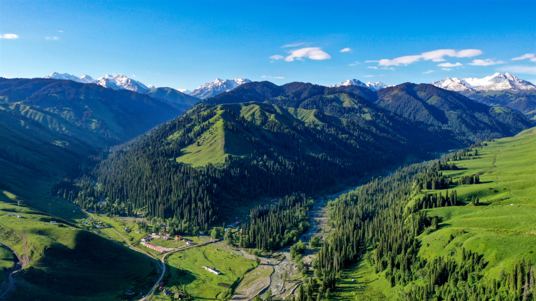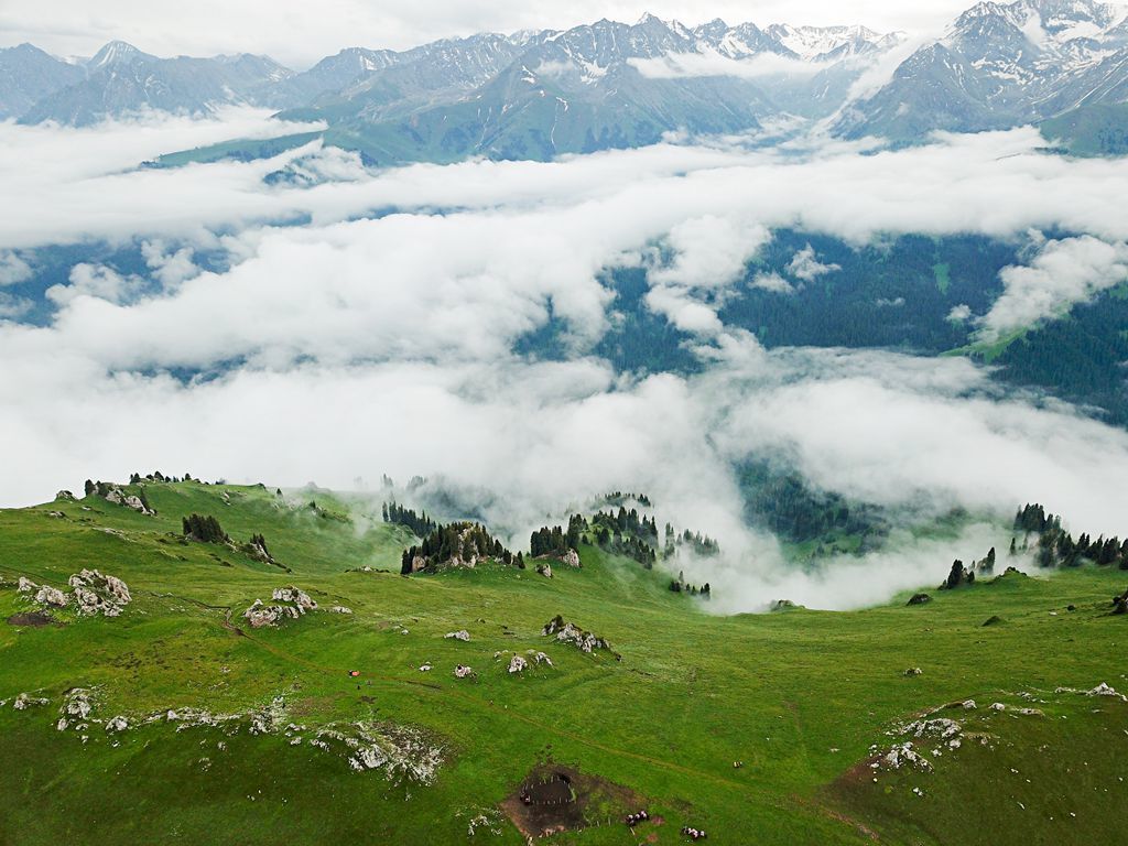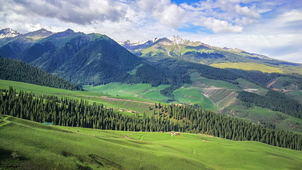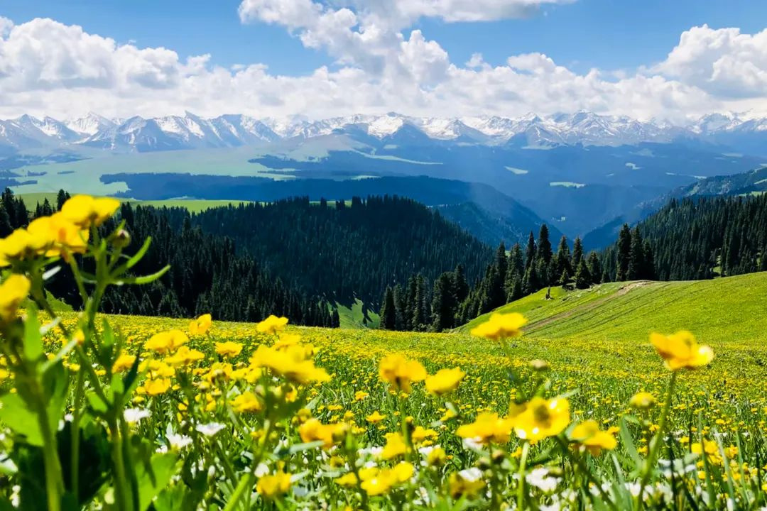 巩乃斯大草原,山峦起伏,群山叠翠,景致引人入胜。松涛林海,繁花似锦,囊括了天山的诗画之美。