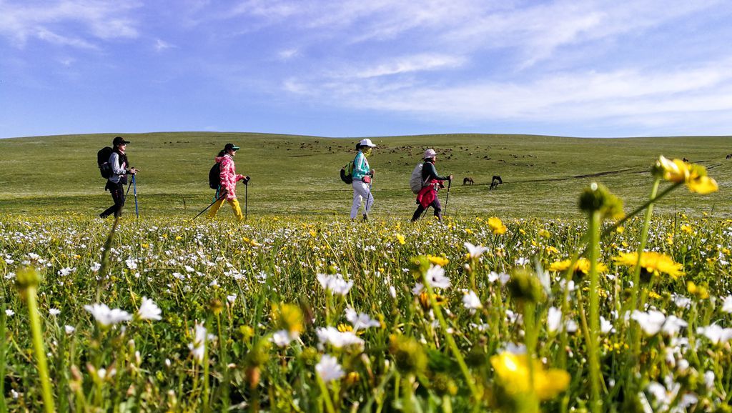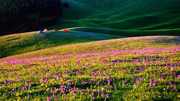 每年5月至9月,草原上各种野花开遍山岗草坡,红、黄、蓝、紫五颜六色,将草原点缀得绚丽多姿。优美的草原风光与当地哈萨克民俗风情结合在一起,成为新疆著名的草原。