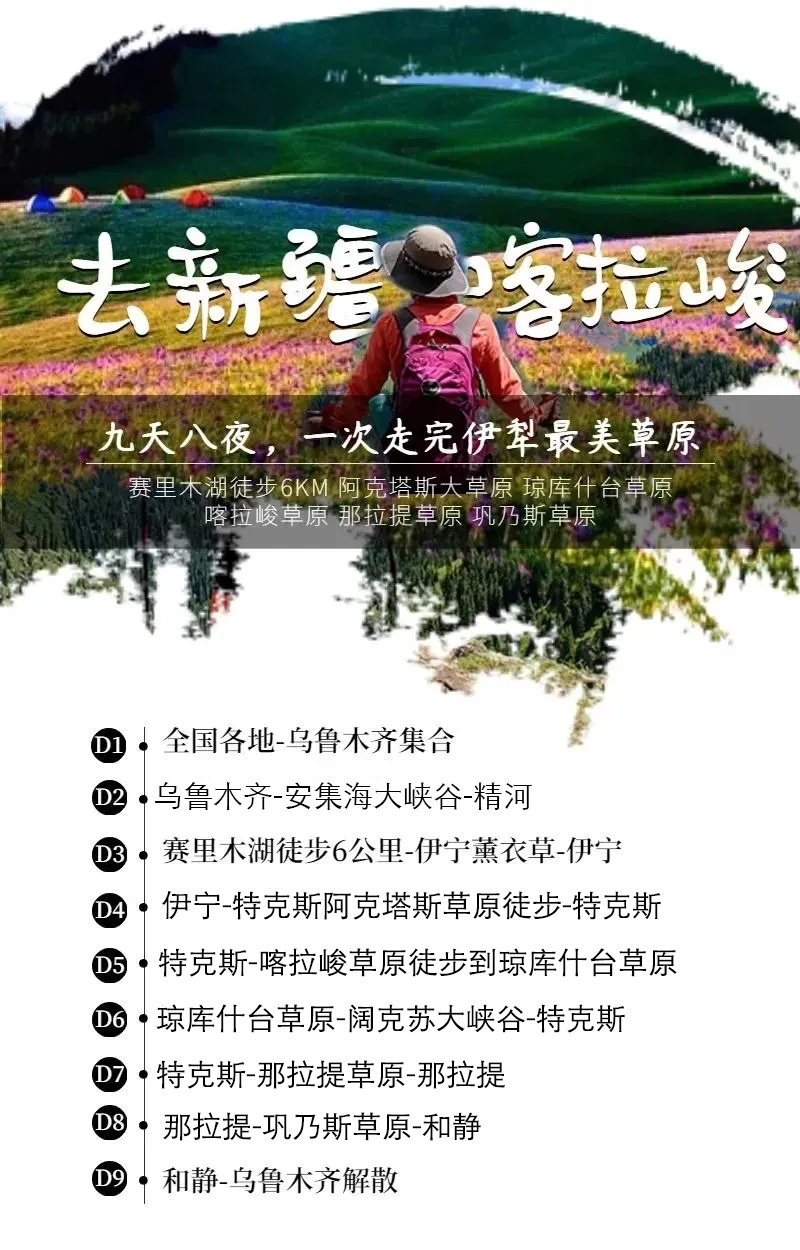 早餐后我们到村后面到乌孙古道徒步5公里,在这5公里感受新疆的著名徒步路线乌孙古道(全程徒步已经禁止穿越)午餐后我们一路经过阔克苏大峡谷、琼库什台草原再次回到特克斯八卦城。