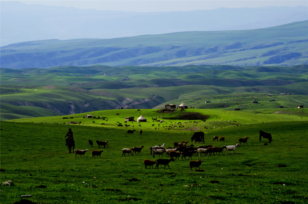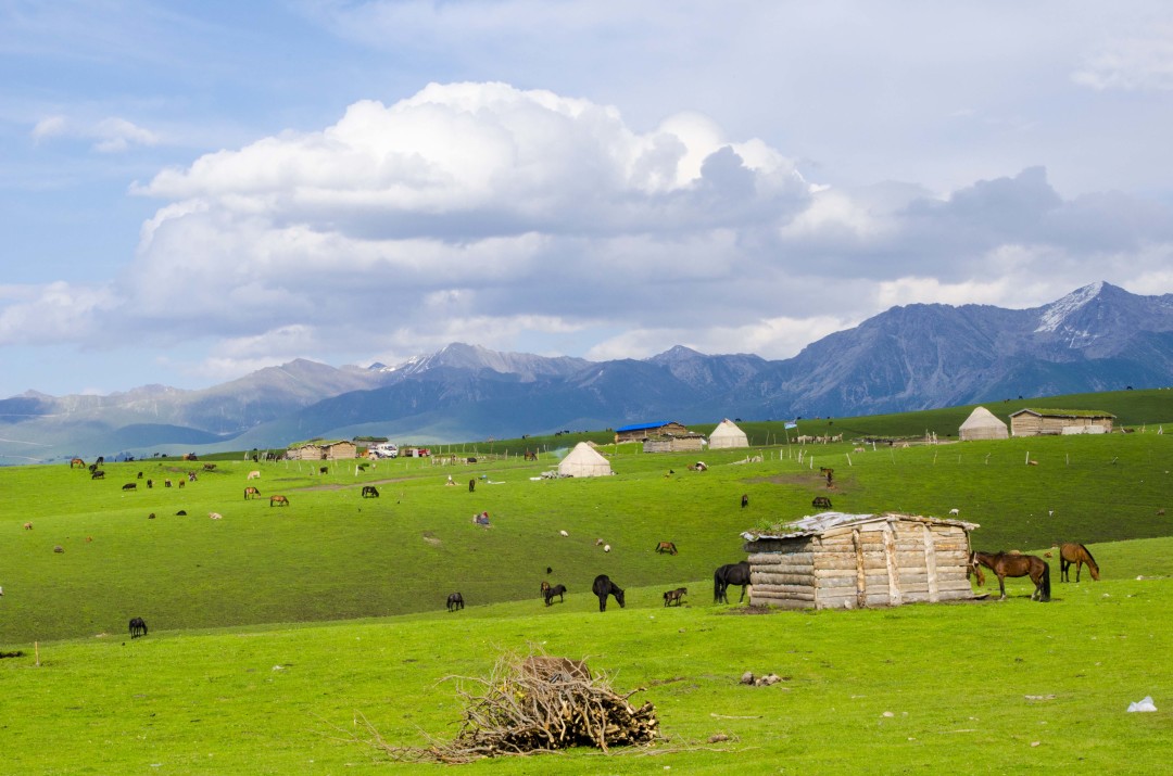 羊群和马群星罗棋布地散落在草原上,那些如星星般散落在草原上的木屋,白色的毡房以及无远处皑皑的雪山构成了一幅生动美丽的高山草原图画。