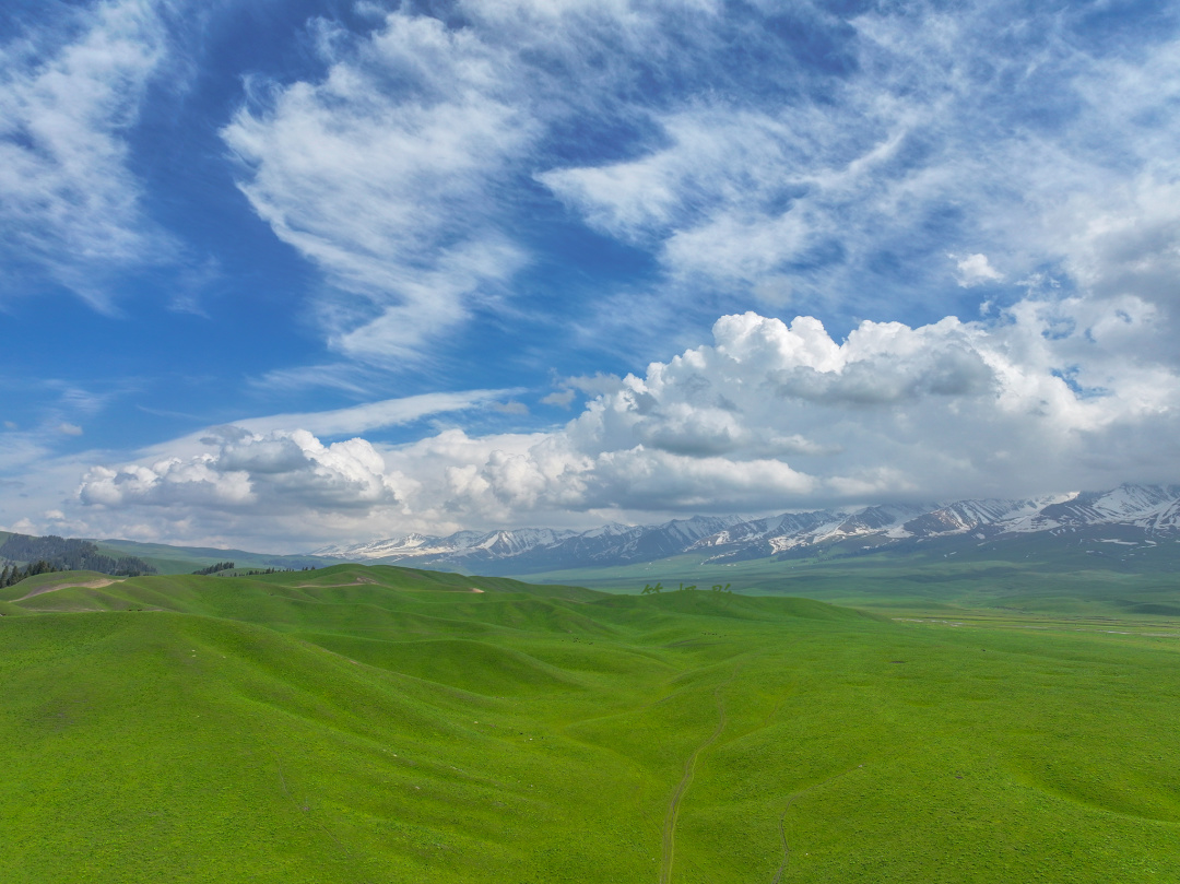 伊犁草原最美的季节在夏季,六七月间草原上绿草如茵,鲜花遍野。在蓝天白云的映衬下,广袤的草场、星罗棋布的畜群、高耸的云杉林和连绵的雪山构成伊犁草原风光经典画面。