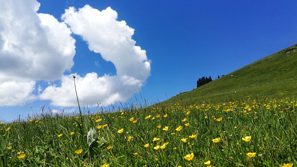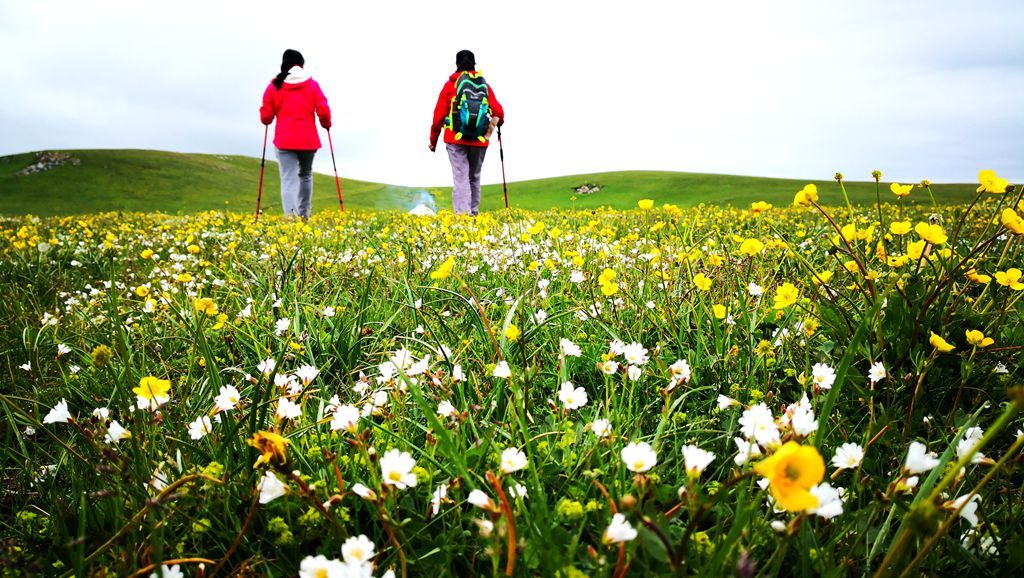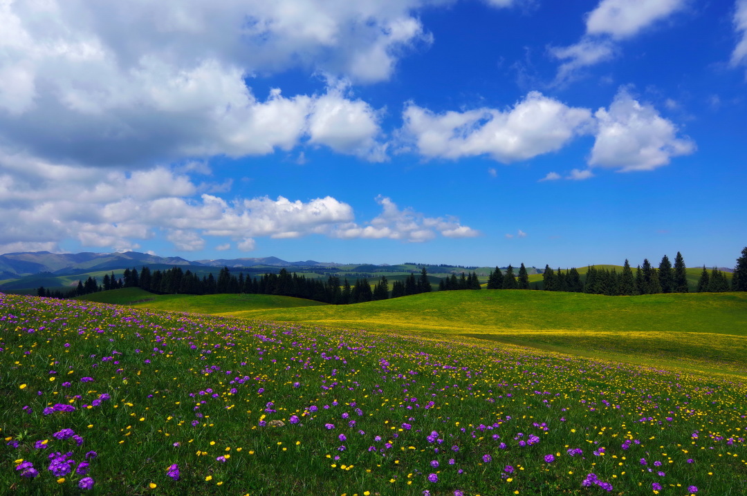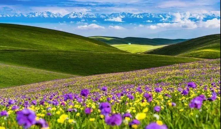 5月开始,草场返青,鲜花盛放,花期长达2个多月,阿克塔斯草原进入一年中最美的时节。在这一望无际的草原上,山丘高低起伏,成片的紫色雪地报春花,加上黄色的驴蹄草,无边的花海和满眼的碧绿令人神清气爽,高山白云相依相伴,一步一景,如诗如画。