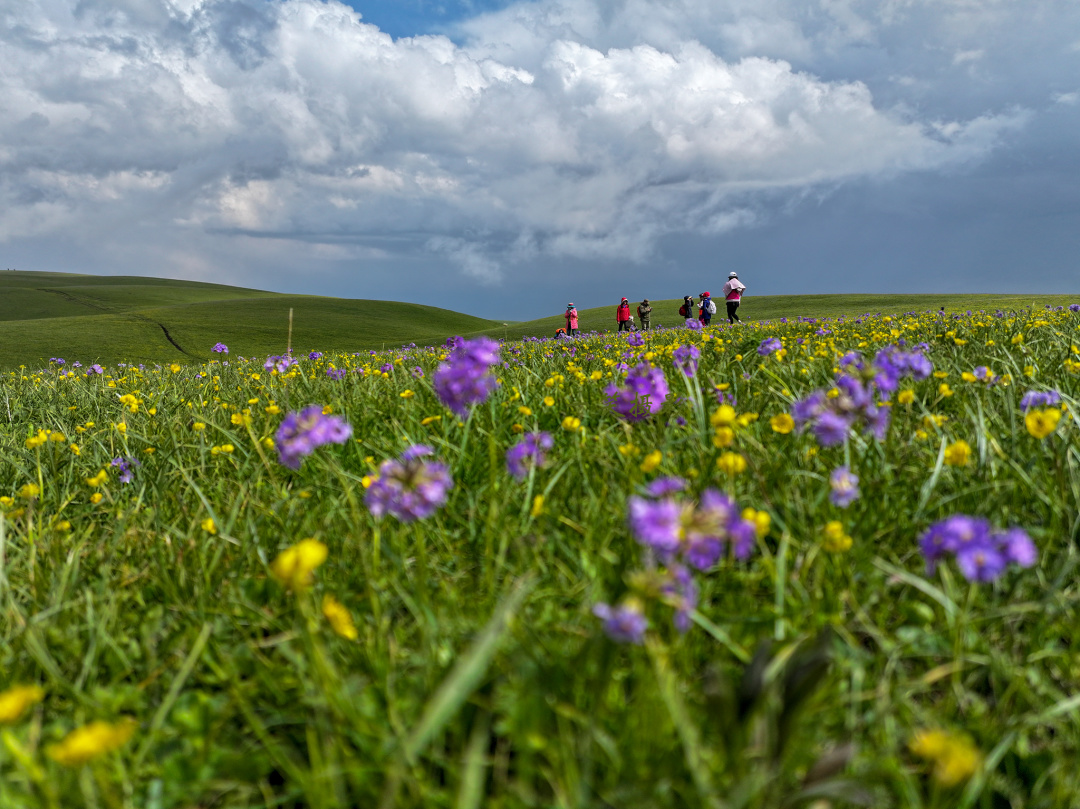 一望无际的草原上一碧千里,而并不茫茫。草原上紫色报春花和小黄花竞相绽放,放眼望去看去,好像给无边的绿毯绣上了彩色的花纹。