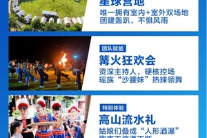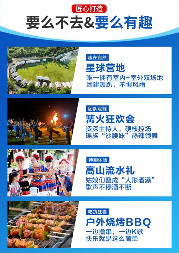 四、【篝火晚会】 (资深主持人硬核控场+瑶族“啊腰妹”热辣领舞) 大家手拉手, 携手共舞, 心与心在火光中贴近。炽热的火焰将我们的身影投在夜幕之上, 在欢笑与歌声里打破距离, 在舞步与节拍中凝聚力量——这是属于我们的热烈时光,更是团队最燃的共同记忆。这一刻,我们不只是并肩的伙伴,更是彼此最闪耀的光!篝火晚会 19:30-20:00 (如遇下雨不能举行无费用可退)