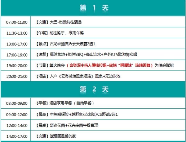 第 1 天:出发—午餐—古龙峡全程漂流/云天玻霸 2 选 1—星球营地+烧烤 BBQ+高山流水 +篝火晚会+户外 K 歌—住云海碱性温泉酒店