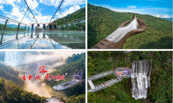 前往游览【古龙峡云天玻霸】 1、玻璃峡谷集玻璃云台、玻璃云梯、玻璃云桥于一体, 总长度 1314 米, 玻璃桥几乎位于同一水平面, 漫步其中, 平步青云, 犹如闲庭散步, 俯视下方, 却又步步惊心。 2、玻璃平台: 全长 202 米, 悬空跨度 72 米, 为美国科罗拉多大峡谷的 U 形桥 (21米) 的 3.5 倍, 顶部是一个直径 16.8 米的玻璃平台, 从底部仰视犹如天外来客。 3、玻璃桥: 全长 329 米, 平均宽度 3.8 米, 最宽处 6.8 米 (张家界玻璃桥宽度 6 米) 。