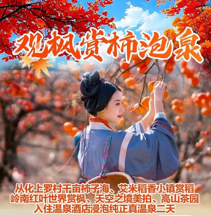 每周六日从化上罗村千亩柿子海、艾米稻香小镇赏稻,岭南红叶世界赏枫、天空之境美拍、高山茶园、入住财富度假酒店浸泡纯正真温泉