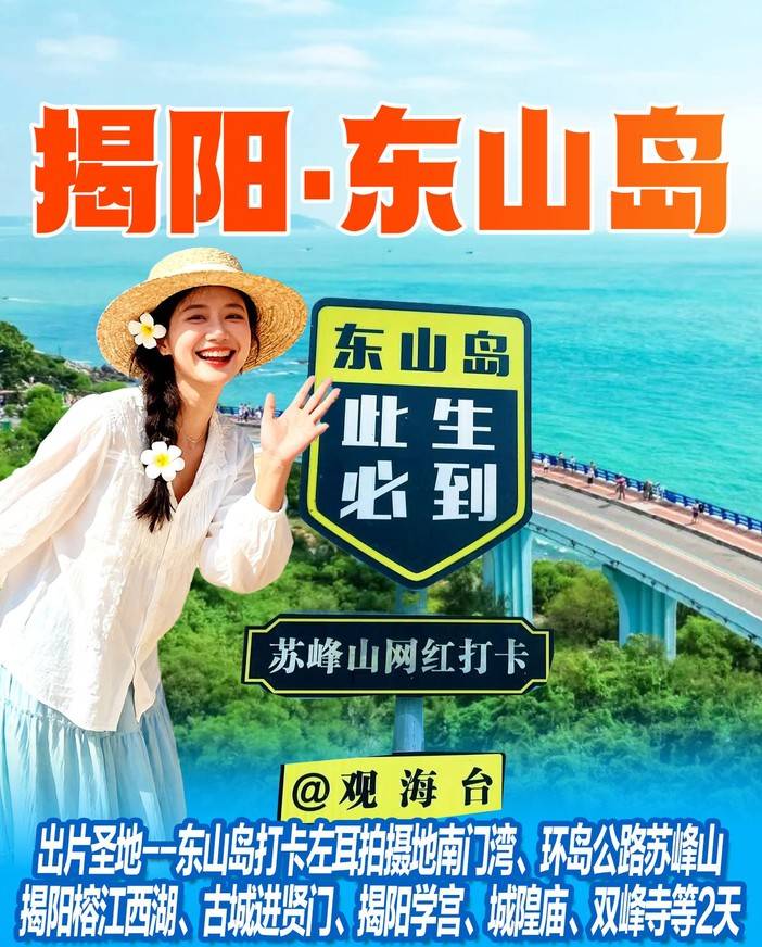 活动亮点 东山岛--出片圣地--绝美小众海岛,中国的“马尔代夫”、“最美蝴蝶岛”东山岛,打卡左耳电影拍摄地南门湾、网红苏峰山公路等 揭阳---游揭阳西湖,逛揭阳古城,观仅次于山东孔庙的第二大行宫揭阳学宫感受千年儒家文化精髓,逛“国...