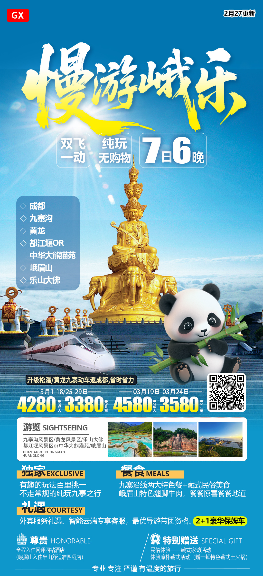 慢游九寨+峨乐双飞一动7天: 天天发团