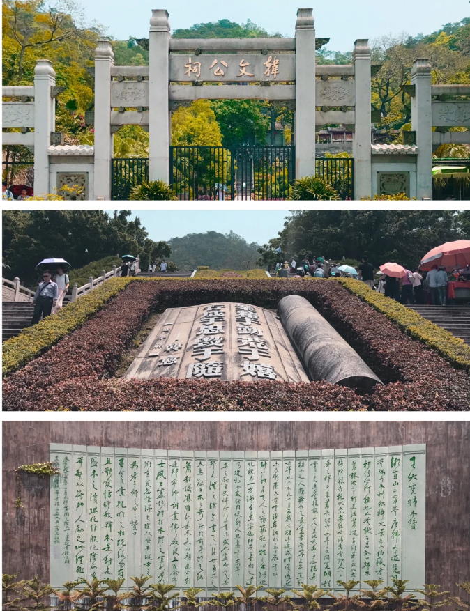 游览【韩文公祠】,即韩愈纪念馆。背靠韩山,面临韩江。韩文公祠倚山临水,环境清幽。祠堂现有三层殿阁。韩祠面宽18. 7米,祠体正面墙壁用坚实的水磨青砖砌筑。砖墙与梁桷衔接处,皆按不同弧线精工雕磨,使砖木紧密贴合。祠门上有石匾古隶书“韩文公之祠”。祠前有庭,进仅丈许,外砌石栏。祠分前后两进,头进门厅,后进是三开间大堂,比进升高2.5米,共深31.8米。中间小院,左右庑廊。祠内环壁嵌有明清以来的碑刻40通,正座塑有韩愈坐像