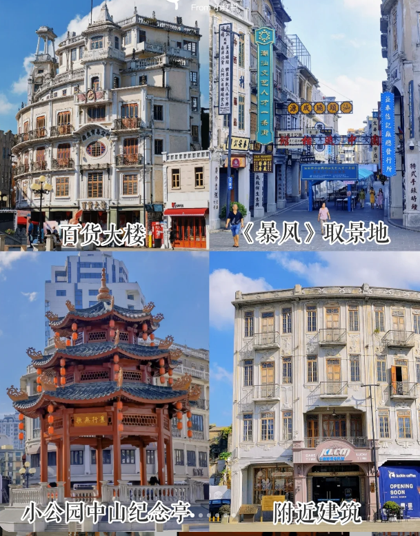 【老妈宫戏台】绝不能错过的潮汕文化打卡点,风格为中西合璧,建筑外墙采用红色清水砖搭配彩色玻璃和大开口柚木门窗,每逢妈祖诞旦与重大民俗节庆日,民众在此搭建戏台举行演出。戏影幢幢,人潮挤挤,史称“妈宫前”,是汕头作为海丝重要门户的历史遗迹,也是老一辈汕头人及海外华侨的美丽记忆。后【汕头旅社】凝结着海内外潮人的乡愁,诉说着那个时代的汕头故事,旅社旧址位于汕头市金平区商平路43号,始建于1948 年,五层欧式骑楼建筑,网传不到汕头旅社来拍照打卡,等于白来潮汕,所以一定要在此留个影哈。【镇邦美食街 】汕头特色美食一条街,两侧的骑楼是汕头作为百载商埠的缩影,汇集家中华老.字.号传统美食店,吃不完,根本吃不完!然后游览“汕头记忆”的汕头老市区【小公园】穿行开埠旧街区 ,感悟汕头百年史,小公园并不小,它的中心是一座名为“中山纪念亭”的小亭子,以亭子为发端,名为“四永一升平”的一条条骑楼老街呈环型放射状,形成蔚为壮观的城市街区。这里就是汕头开埠的发祥地,曾经云集数千家店铺商行,见证了当年汕头经济的繁荣。游览【小公园骑楼】骑楼和街路呈扇形放射状分布;形成了具有20世纪30年代建筑特色的繁华商业区、文化区。片区内的百货大楼高7层,由于骑楼的建筑老化,20世纪百货大楼进行了大型修建。前身是1932年华侨集团集资创办的“南生公司”,为解放前汕头第二高楼,是老汕头的标志性建筑及小公园的象征之一。