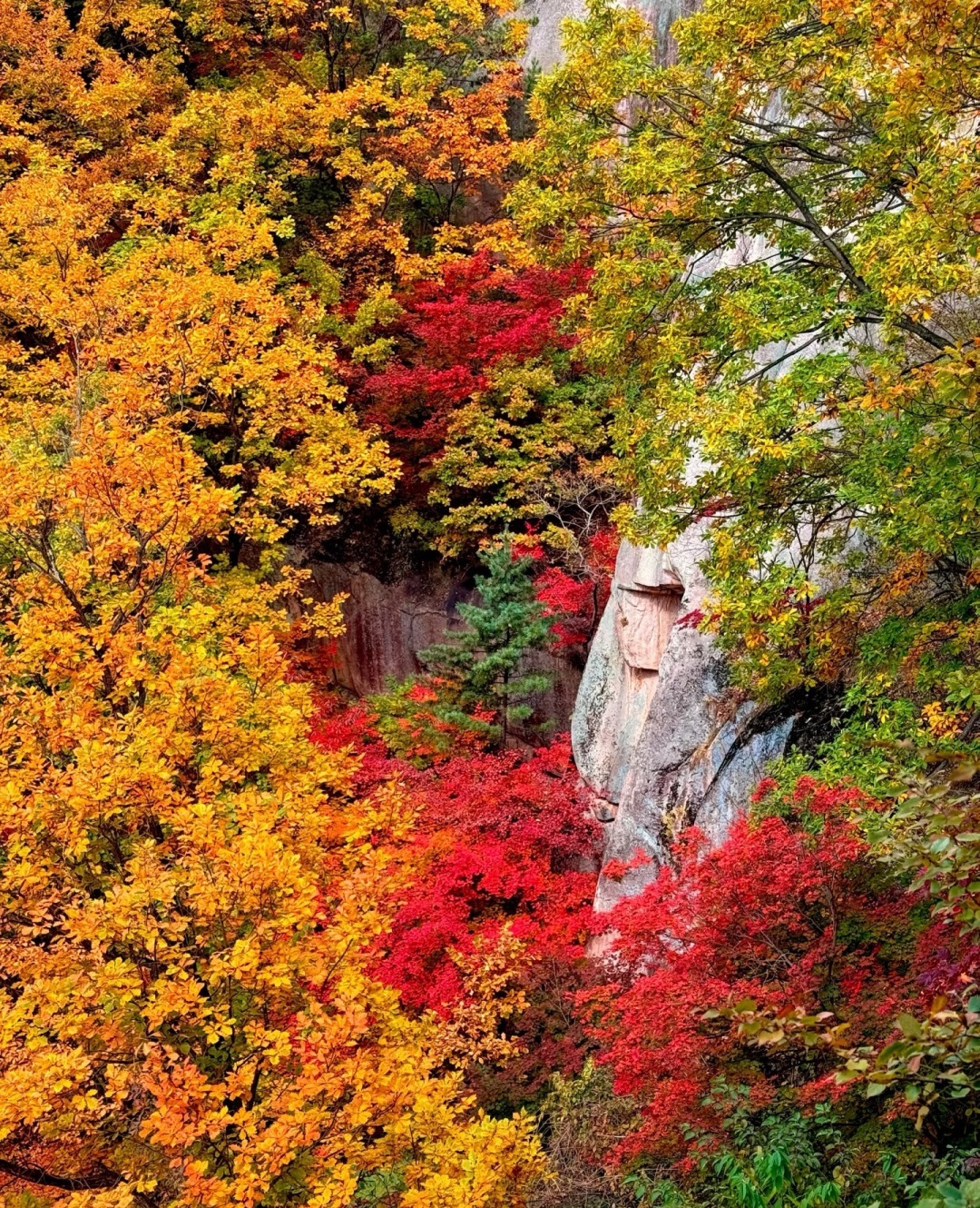 沿着盘山的公路上山,触目皆是浓烈的金黄,树叶伴着秋风舞动,恍惚间,你会觉得自己闯入了秋日的油画世界,一切美得那么梦幻不真实。