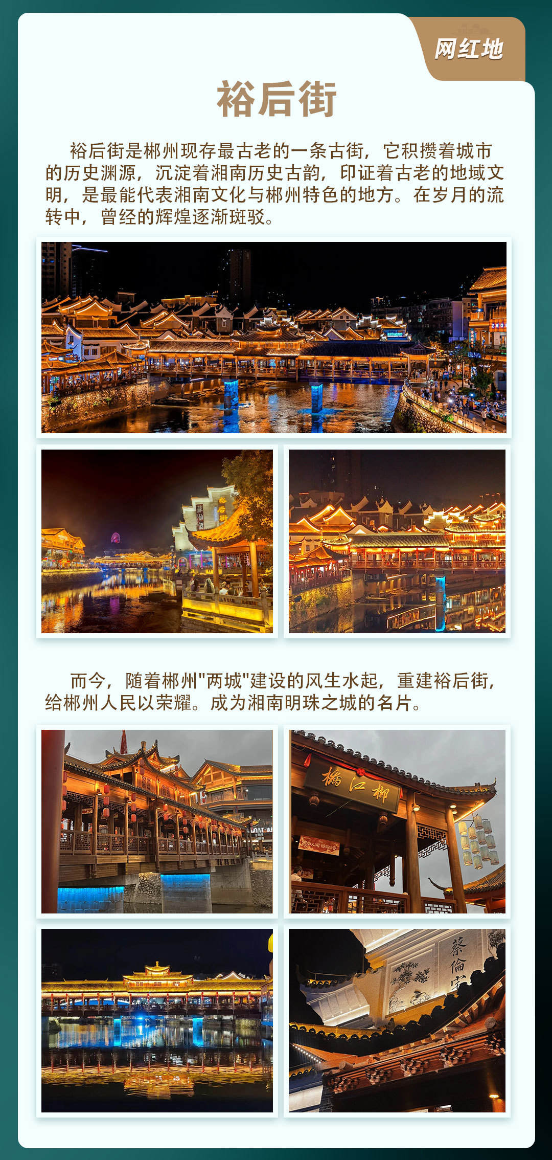 晚上自由活动,自由约伴晚餐;晚饭后逛郴州的“凤凰古城”裕后街,欣赏夜色,享受当地美食,想旅拍的小伙伴可以租个民族服饰旅拍哟!