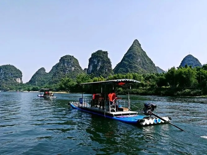 乘坐竹筏游【漓江】(碧岩阁-草坪/草坪-碧岩阁段),漓江两岸群峰连绵,相映成趣,感受“分明看见青山顶,船在青山顶上行”的绝妙景致,让您在这如梦如幻的人间仙境中,体验到“桂林山水甲天下”诗句的由来。与漓江水0距离接触,是真正的游山玩水,漓江竹筏被称之为”水中法拉利“。乘竹筏游览,是体验漓江美景最好玩的游览方式