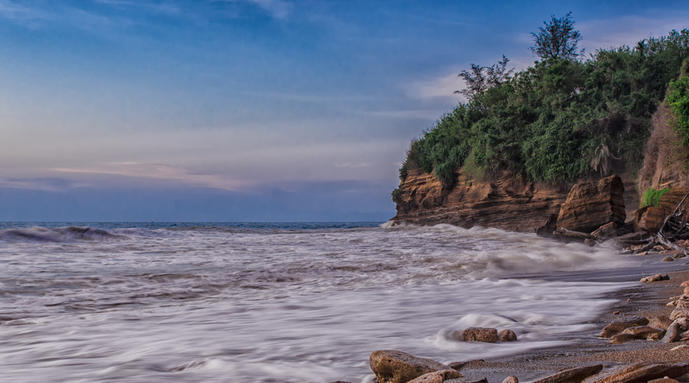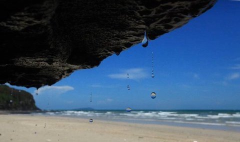 在涠洲岛滴水村南岸边,原名滴水岩。绝壁上部绿树成荫,涠洲岛滴水丹屏海滩壁上层间裂隙常有水溢出,一点点往下滴,如朱帘垂挂。