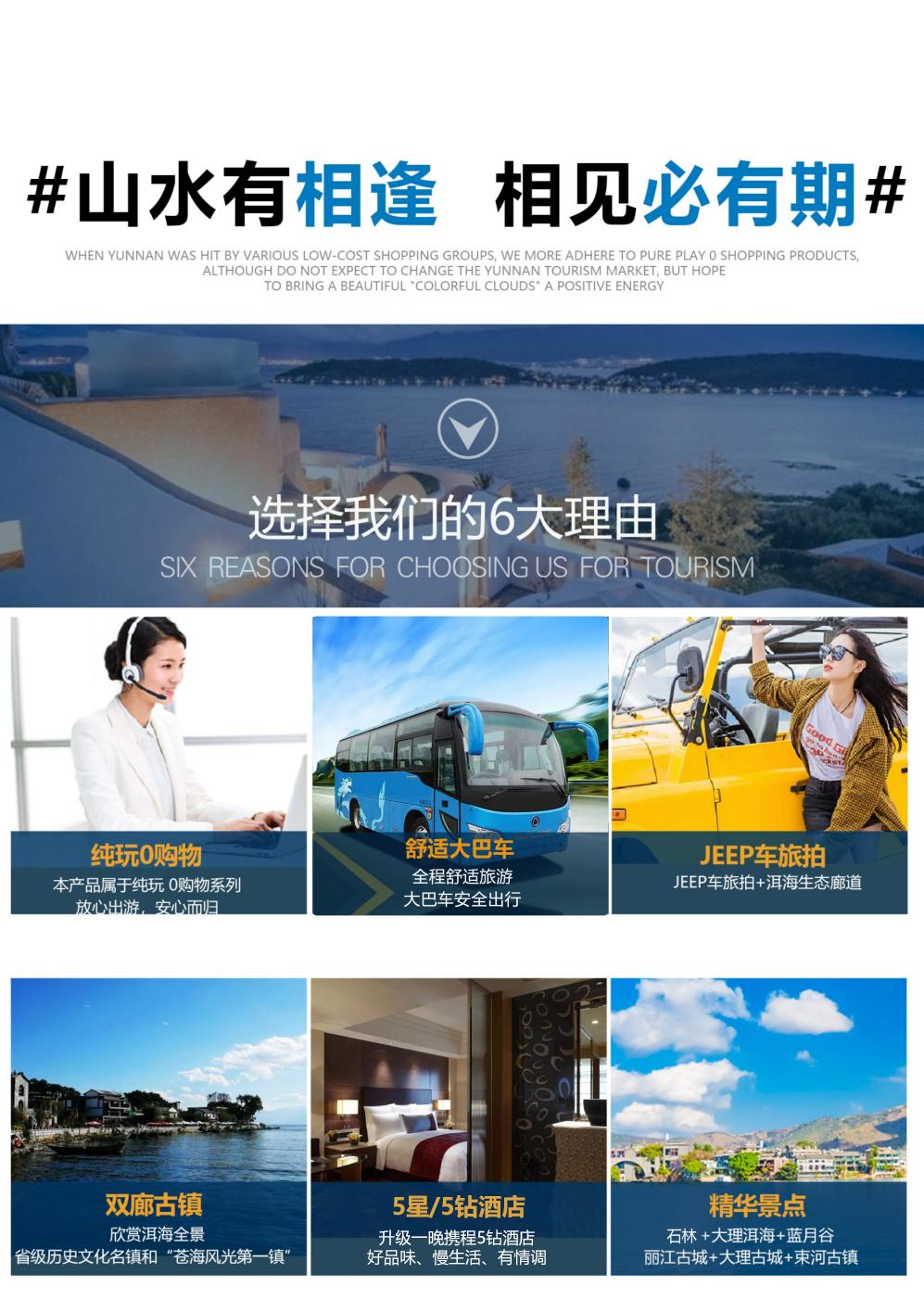 云南当地地方保护政策,不同的城市需要不同的导游来带团,故本行程,昆明,大理,丽江,由不同的导游带团,本行程6天的团由2个导游来完成,不会降低行程的质量,住宿标准。