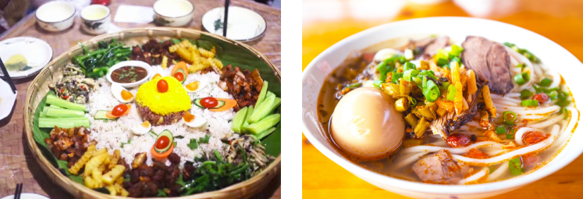 云南饵块:大米为原料,可烤、炒、煮、炸,烤饵块外皮微脆,内馅丰富;炒饵块口感软糯,配料多样。